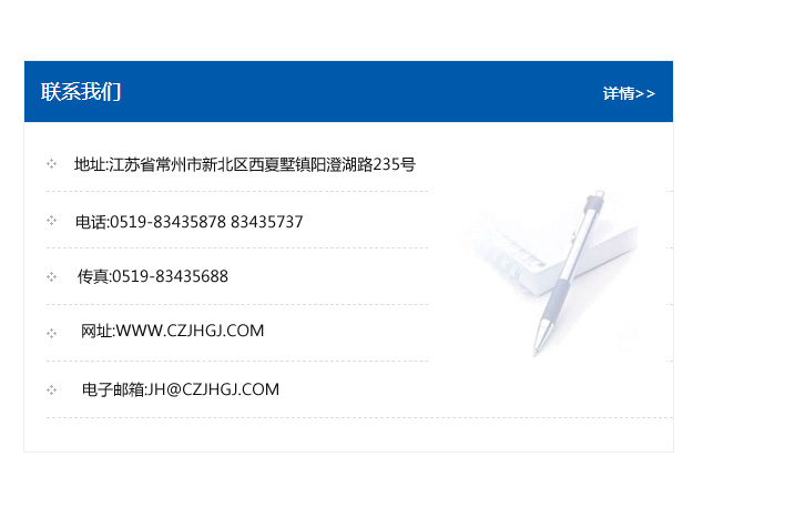 傳真:0519-83435688    郵編:213135    網址:WWW.czjhgj_com.datang518.com    電子郵箱:JH@czjhgj_com.datang518.com